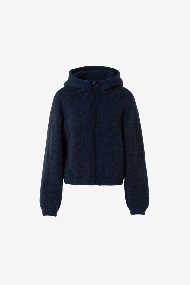 Kurz geschnittener Strick-Cardigan aus Kaschmir-Seiden-Bouclé im Blouson-Stil. Mit Stehkragen und angesetzter Kapuze.