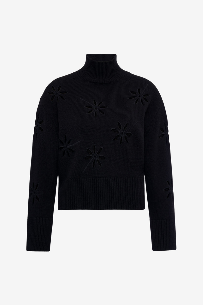 Kurz geschnittener Strickpullover mit Stehkragen und breiten, gerippten Bündchen. Florale Applikationen setzen verspielte Akzente und verleihen dem schlichten Design eine moderne, feminine Note.