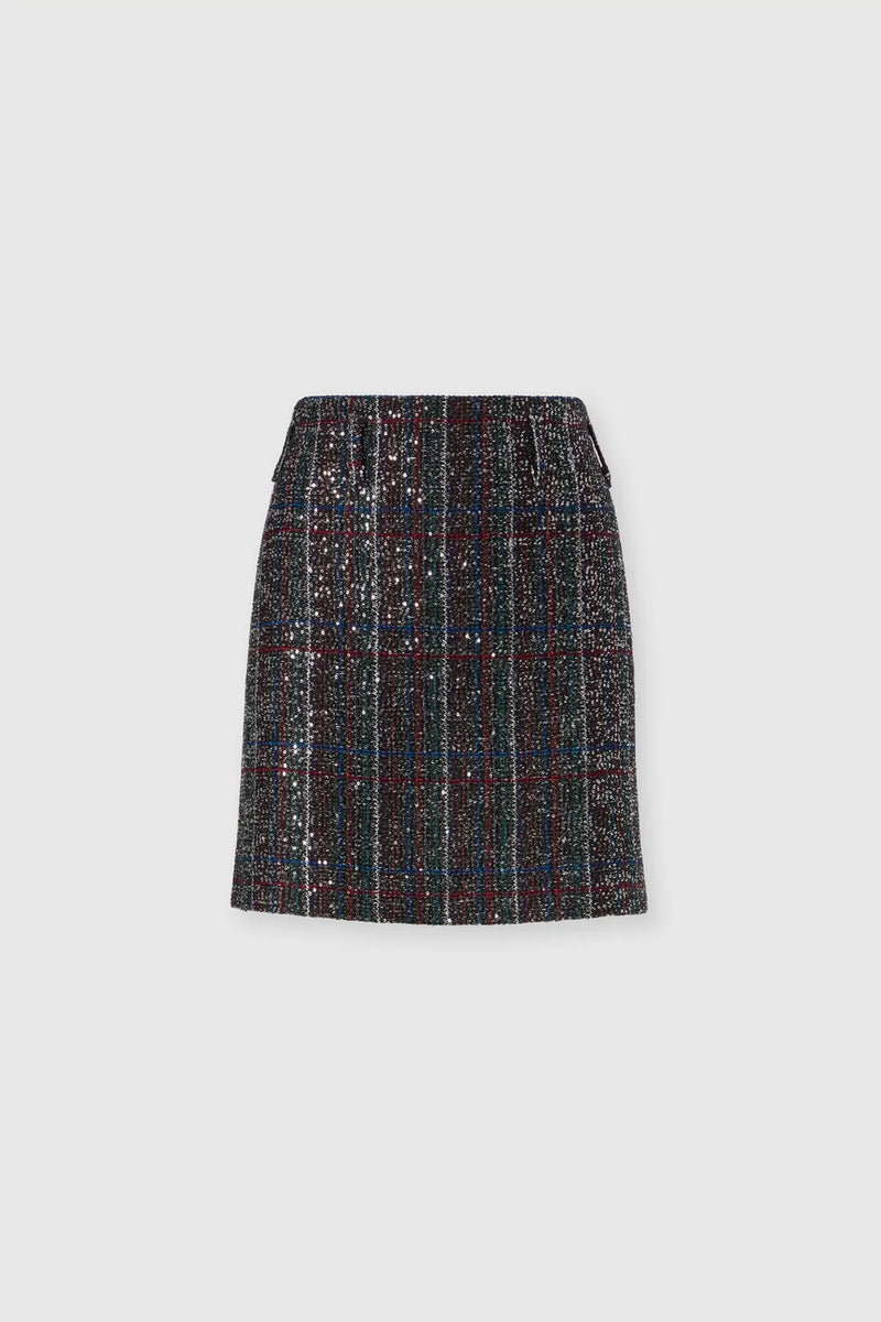 Dieser Rock präsentiert ein elegantes, mehrfarbiges Karomuster auf dunklem Grund, das ihm eine moderne und zugleich zeitlose Ausstrahlung verleiht. Die strukturierte Weboptik bringt Tiefe und einen leicht schimmernden Effekt in das Design. Durch seinen geraden Schnitt lässt sich der Rock vielseitig kombinieren – sowohl für den Alltag als auch für festlichere Anlässe.